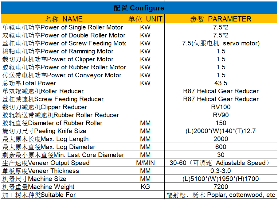 进给电机为7.5kw伺服电机。它可以确保机器稳定的运行,稳定的旋转剥离速度和准确的贴面厚度。因此,该机器可以生产高质量的贴面